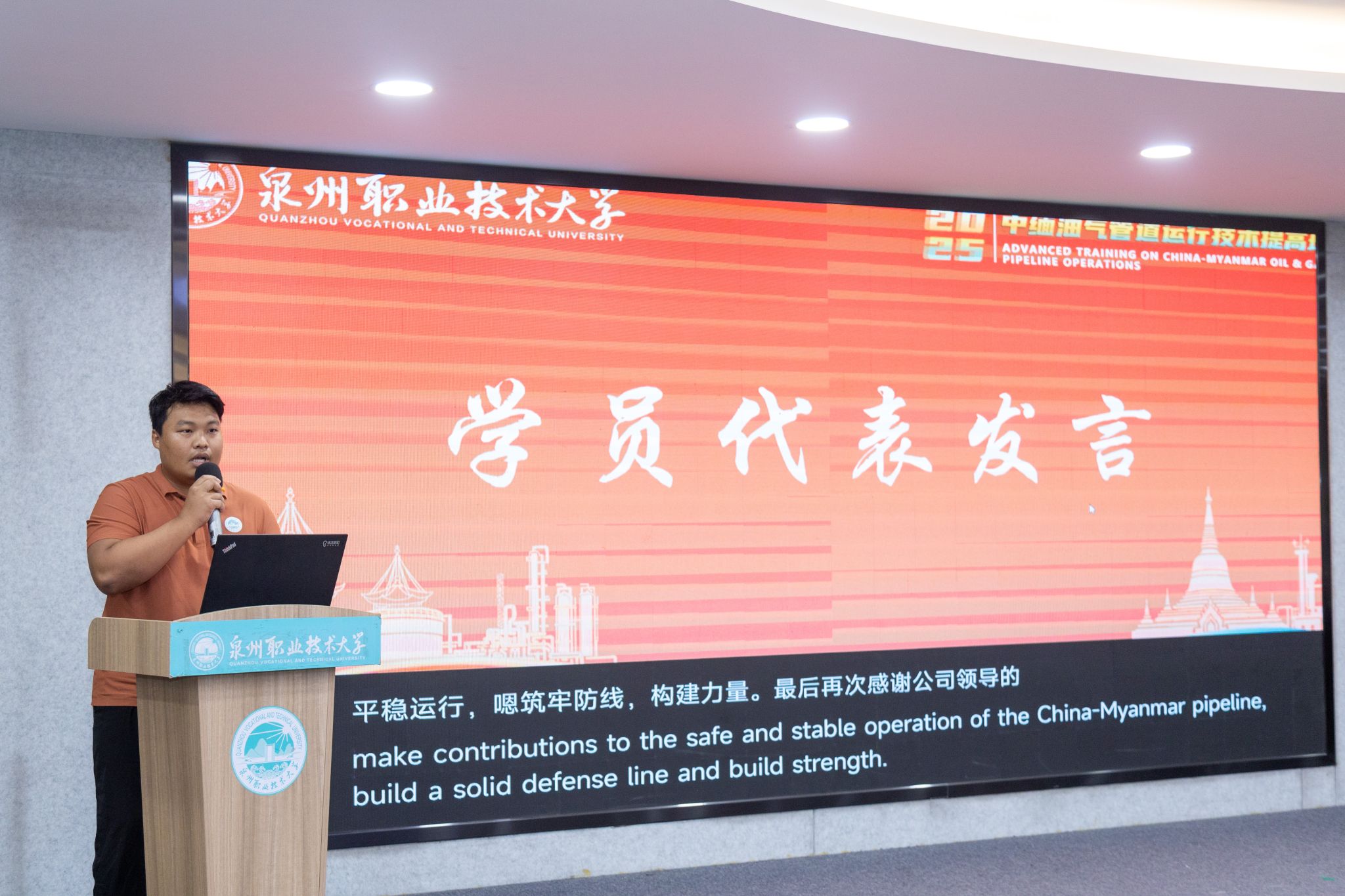 “结业不是终点,而是履职尽责的新起点。”10月14日,中缅油气管道运行技术提高班,为期近一个月的培训,在泉州职业技术大学画上圆满句号。结业仪式上,缅甸籍学员代表朱先积 (Kyuu Sai Kyi)发言表示,他们将把在泉大所学的专业知识、实操技能,转化为守护油气管道安全的实际行动。