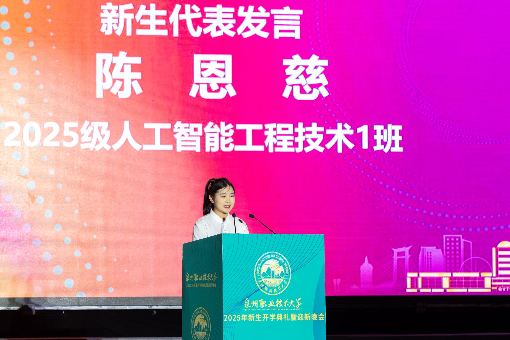 2025级人工智能工程技术1班的陈恩慈作新生代表分享,她讲述了高中时期参与国际交流与社区服务的经历,认为荣誉是“认真做事”的副产品。