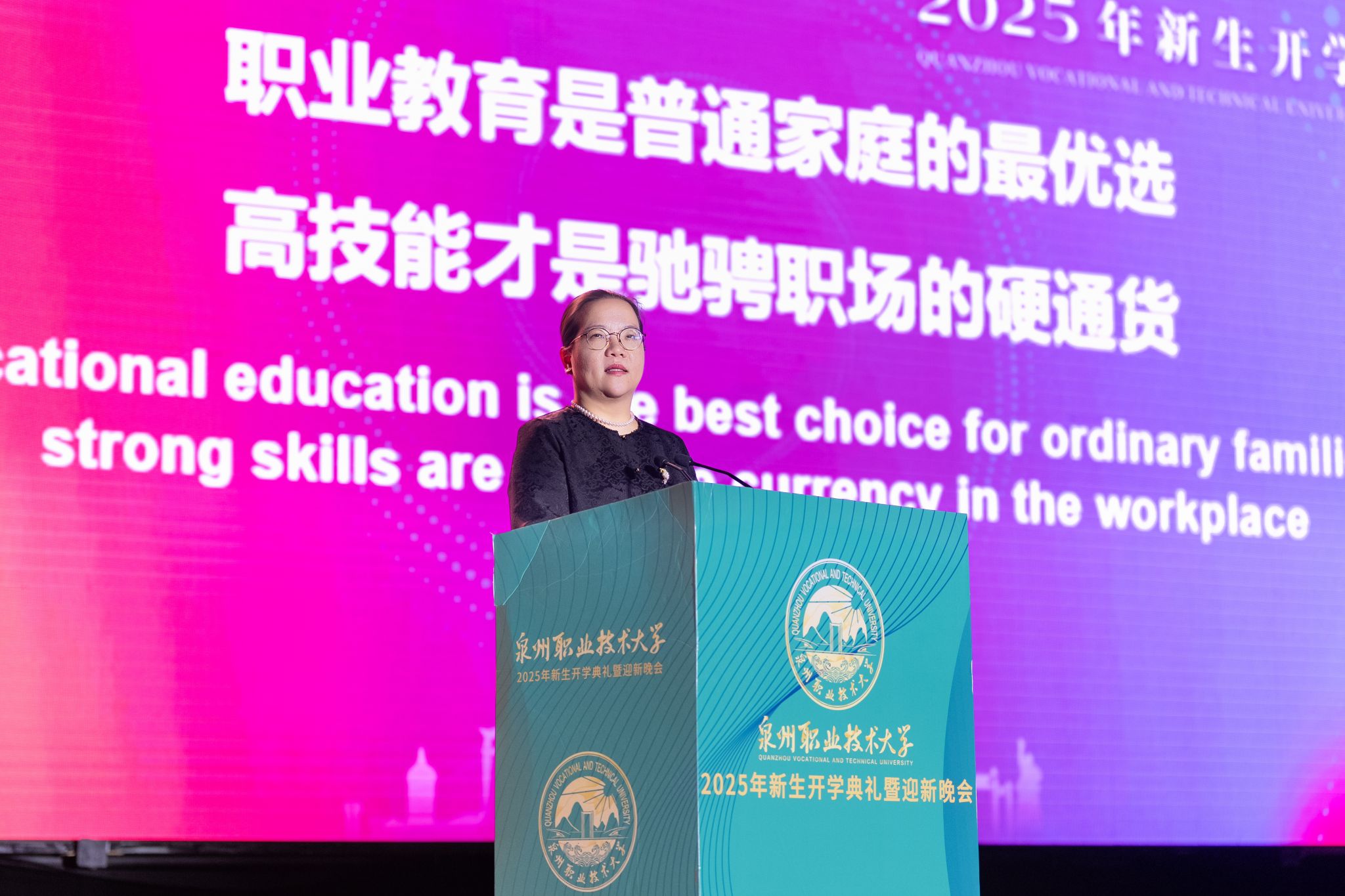 吴滨如以“职业教育是普通家庭的最优选,高技能才是驰骋职场的硬通货”为题致辞。