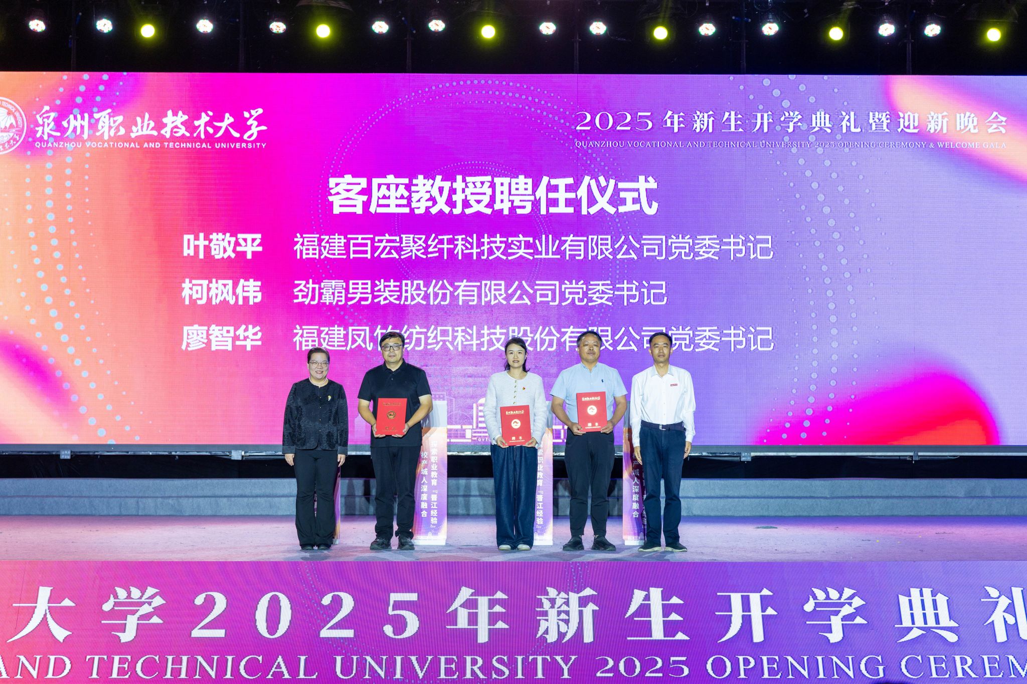 劲霸男装股份有限公司党委书记柯枫伟、凤竹纺织科技股份有限公司党委书记廖智华、百宏聚纤科技实业有限公司党委副书记张端蓉、学校党委书记傅志雄进行党建共建签约,并聘任三家企业的党委书记为学校客座教授。