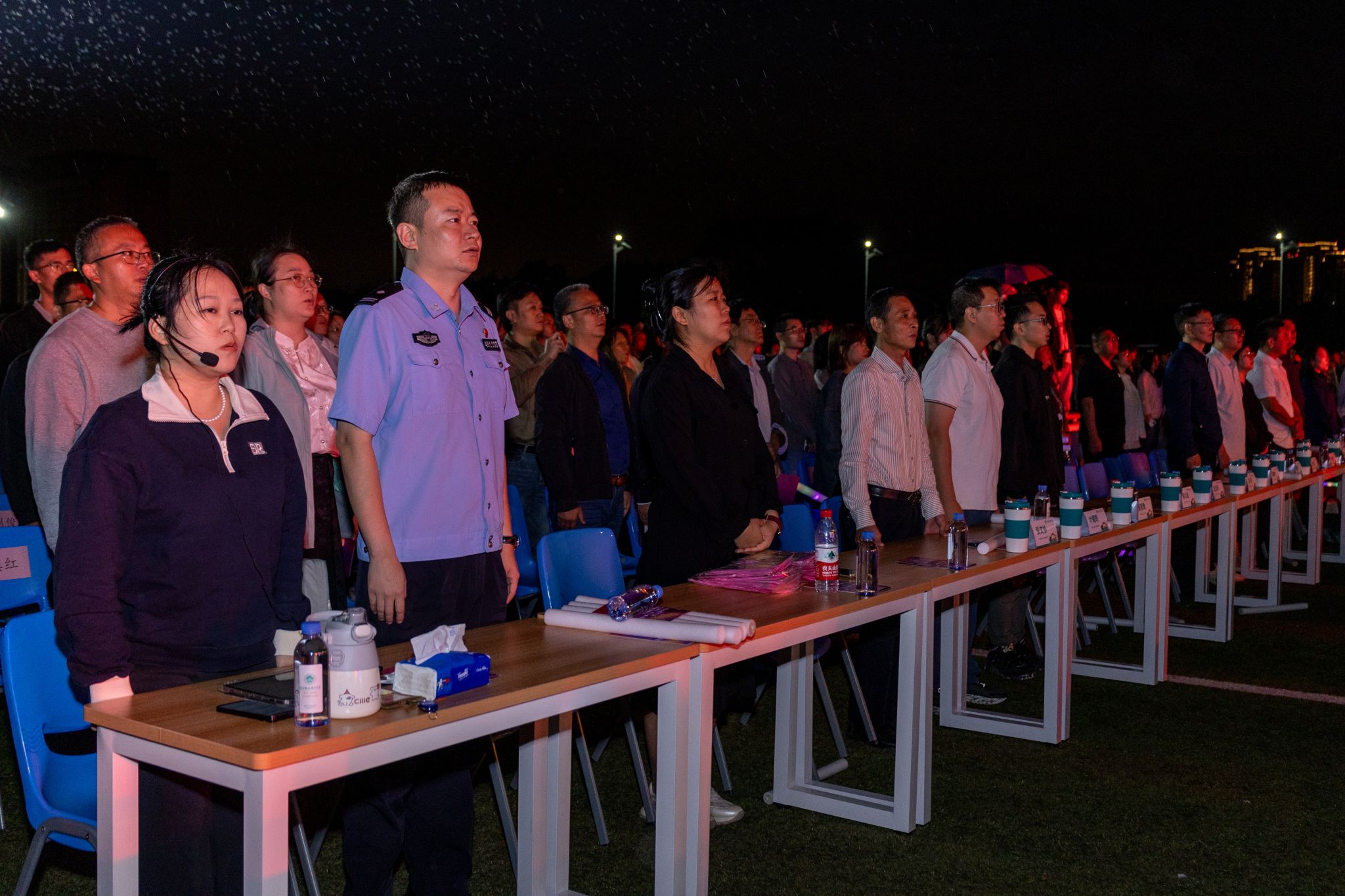开学典礼在庄严的国歌声中拉开帷幕,全体人员起立向国旗行注目礼,齐唱国歌。