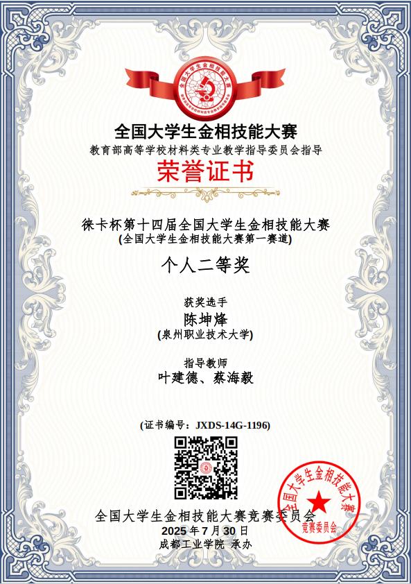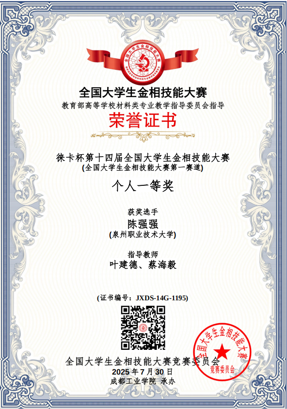 7月25日至30日,由教育部高等学校材料类专业教学指导委员会主办的“徕卡杯”第十四届全国大学生金相技能大赛,我校在工学院叶建德、杨雪春、蔡海毅、黄绍金老师的共同指导带领下,获得全国一等奖1项、二等奖2项、三等奖1项、团体二等奖,叶建德老师荣获优秀指导教师奖。(团体奖我校在福建省排名第二,全国第52名;福州大学福建省排名第一,全国第20名)。全国大学生金相技能大赛堪称材料类专业的“武林大会”,汇聚了清华大学等全国顶尖高校的硬核高手。