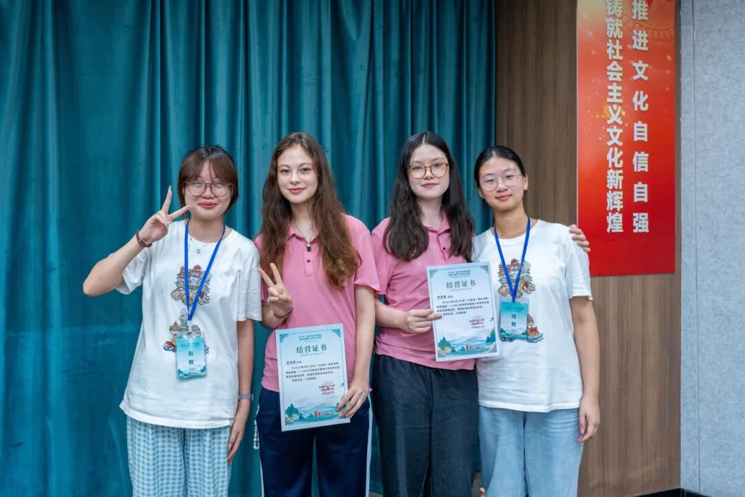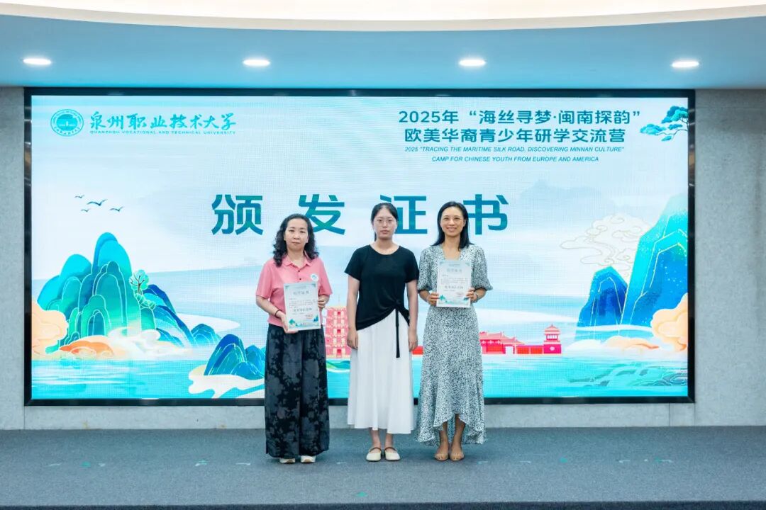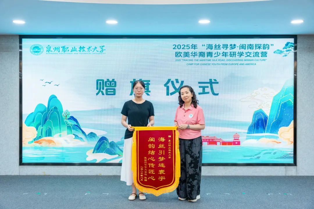 收官日,闭营仪式暨联欢晚会成为情感的高光时刻。助教团队制作的十日点滴视频暖场,帧帧画面唤起共同记忆;助教与营员面对面唱响《再见》,离别成温柔的叮咛;证书颁发环节,每组助教亲手将结业证书递到营员手中,简单的动作藏着朝夕相处的默契与不舍;领队胡鑫老师代表德国汉华中文学校向泉州职业技术大学赠旗致谢,双向的温暖在仪式中流淌。