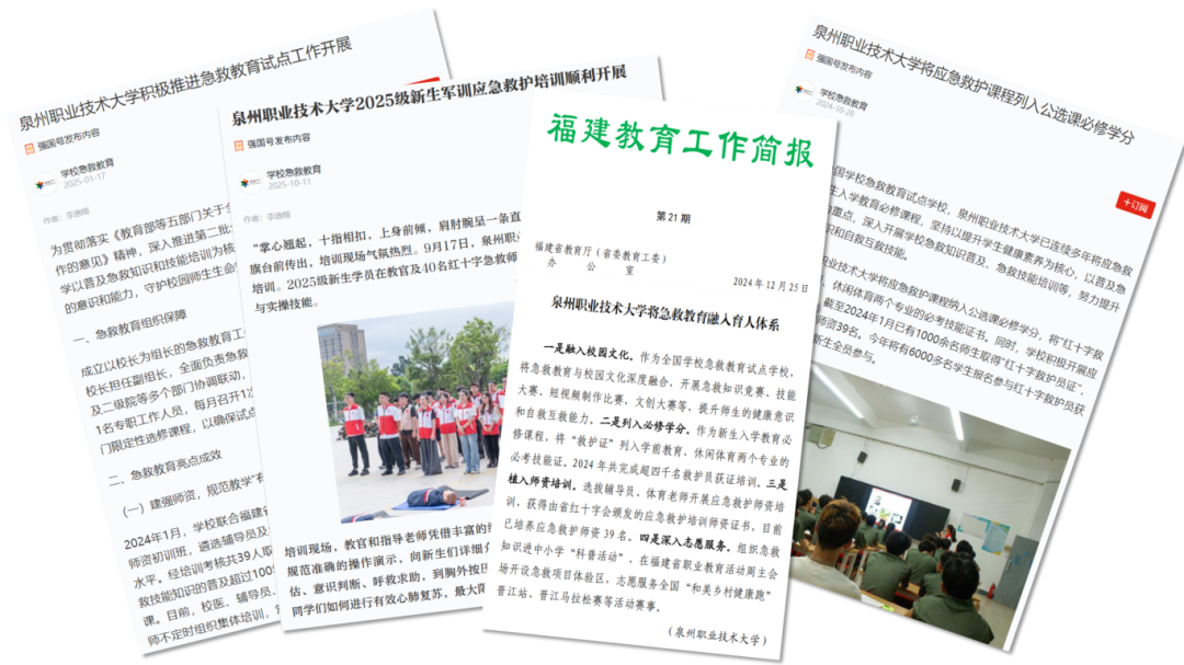 2023年9月,我校获批全国第二批急救教育试点学校,以“有师资、有设备、有课程、有实践学分”的“四有”标准,构建系统化、全覆盖的急救教育体系。将应急救护培训纳入新生入学教育必修课和公选课学分体系,把“红十字救护员证”列为学前教育、休闲体育等专业的必考技能证书,让急救能力成为学生成长的“标配”。截至目前,累计培养64名持证红十字应急救护师资,8671名在校师生取得“红十字救护员证”;2024年开展救护员培训6169人次,今年将推动4500余名学生参与获证培训,实现2025级新生全员覆盖。同时,建成标准化急救教室,在校园操场、教学楼等关键区域布设7台AED设备,并联合晋江市红十字会开展161期应急救护培训,让急救知识从课堂走向生活,构建起“人人学急救、急救为人人”的安全校园氛围。