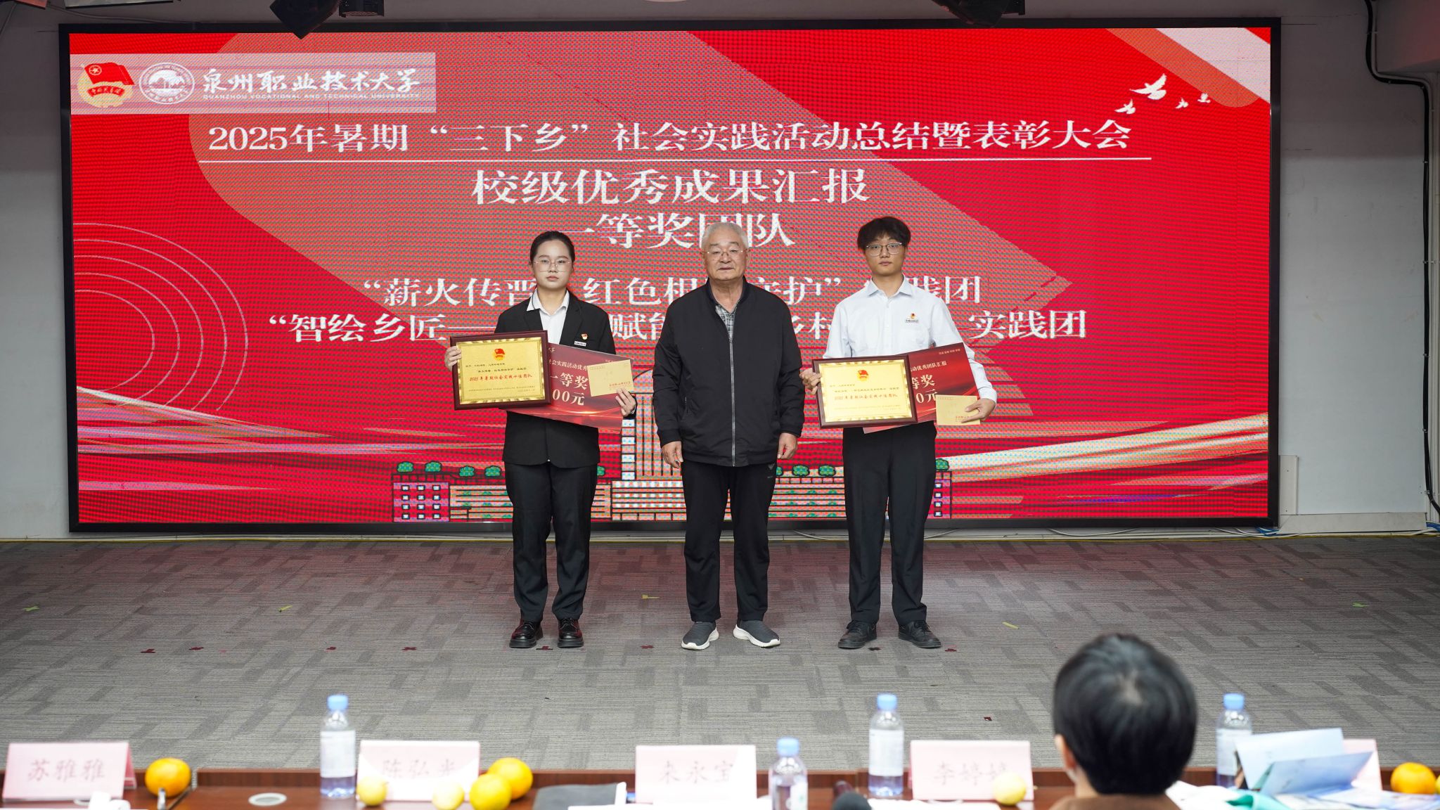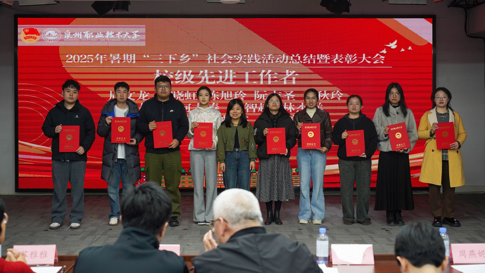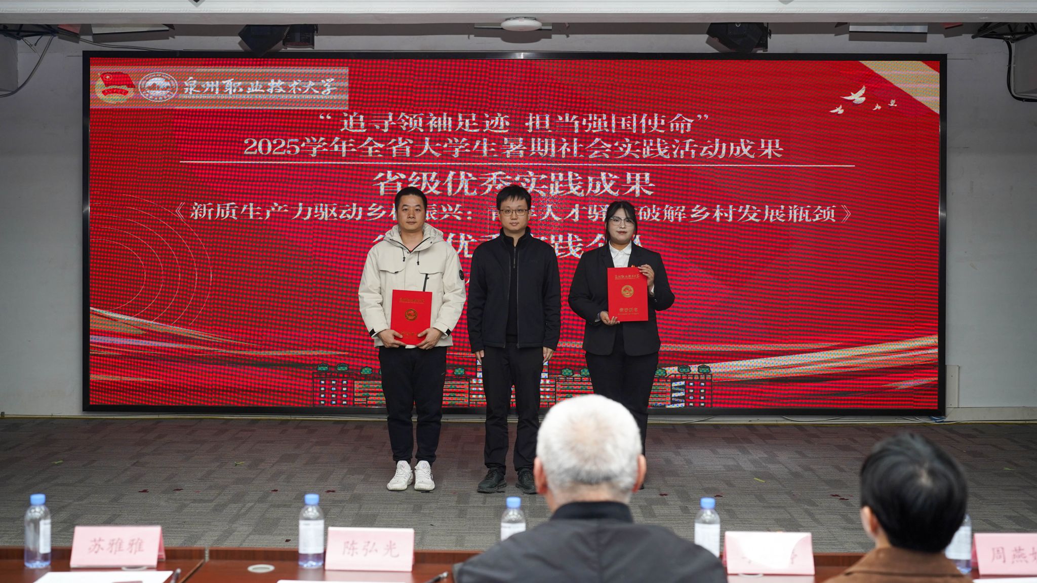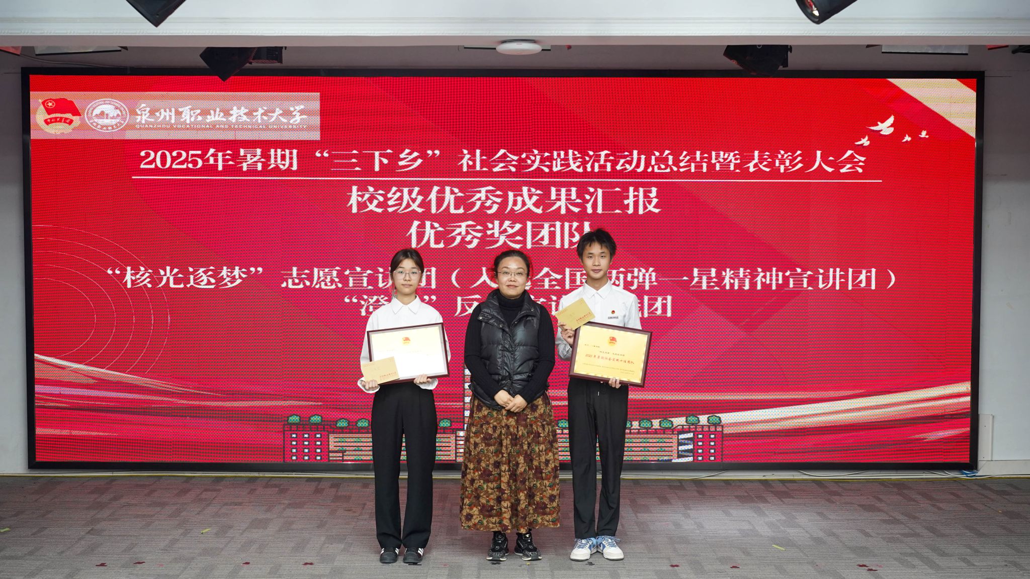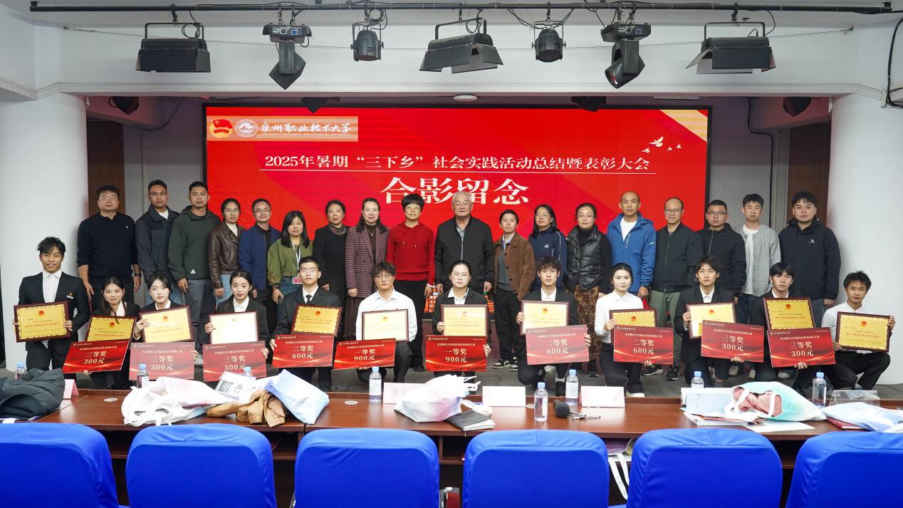 12月4日,泉州职业技术大学2025年暑期“三下乡”社会实践活动总结暨表彰大会在A633报告厅举行。晋江团市委副书记陈弘光,晋江团市委二级主任科员、组织部副部长李婷婷博士,内坑司法所所长苏雅雅,校务顾问、马克思主义学院首席专家来永宝,马克思主义学院院长杜秀娟,学工处处长、校团委书记黄胤聪,以及教务处、学工处、各二级学院负责人、各书院党团书记、实践团队指导老师和学生代表共同出席。
