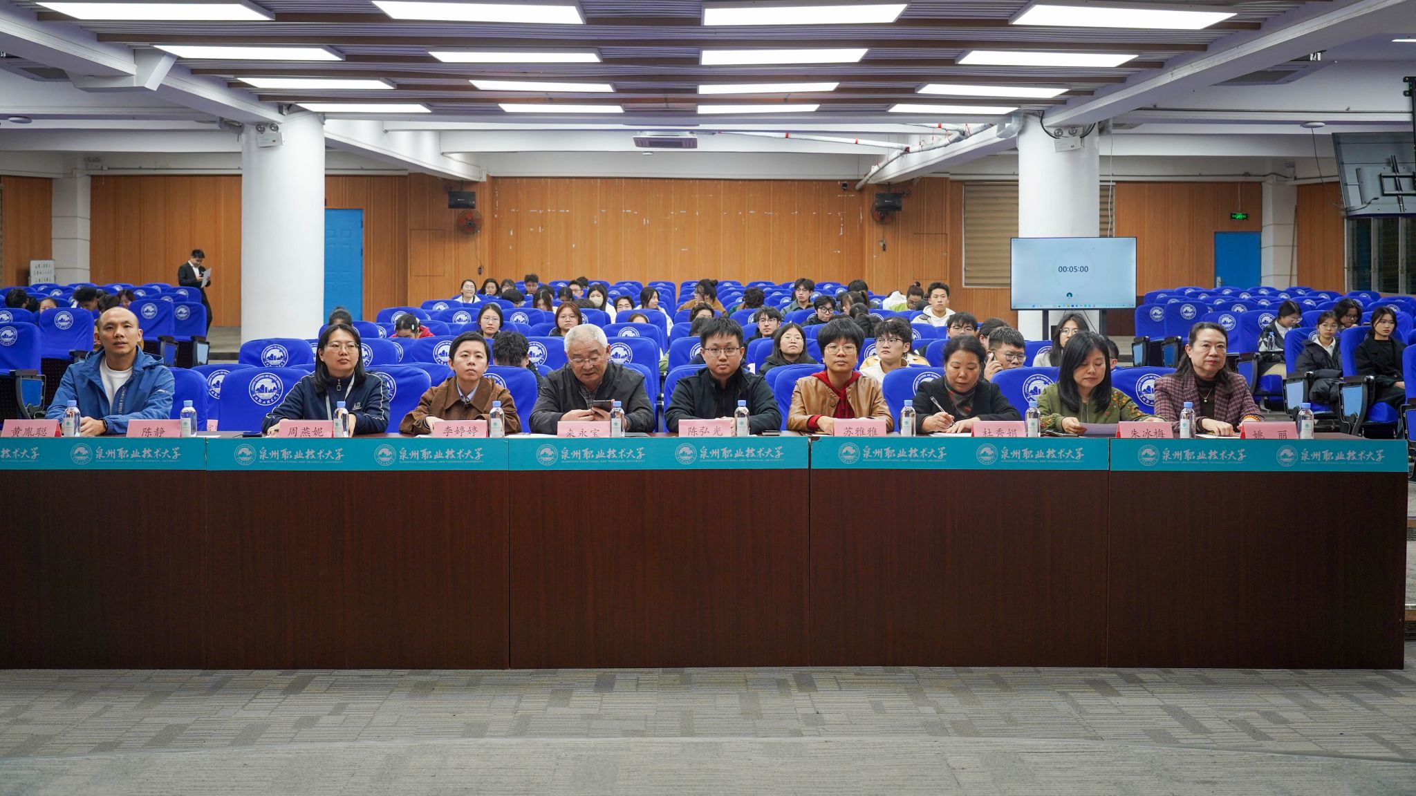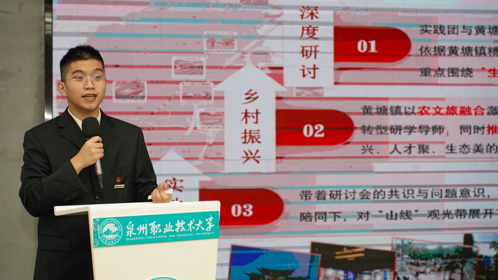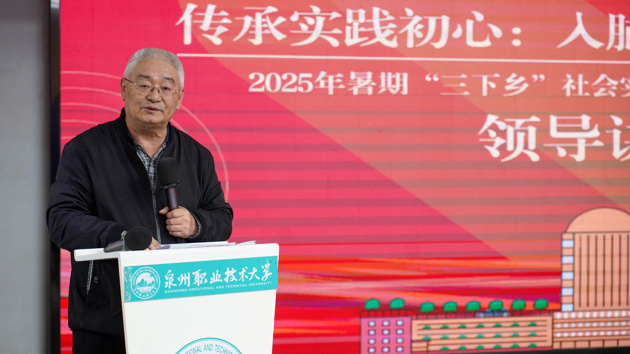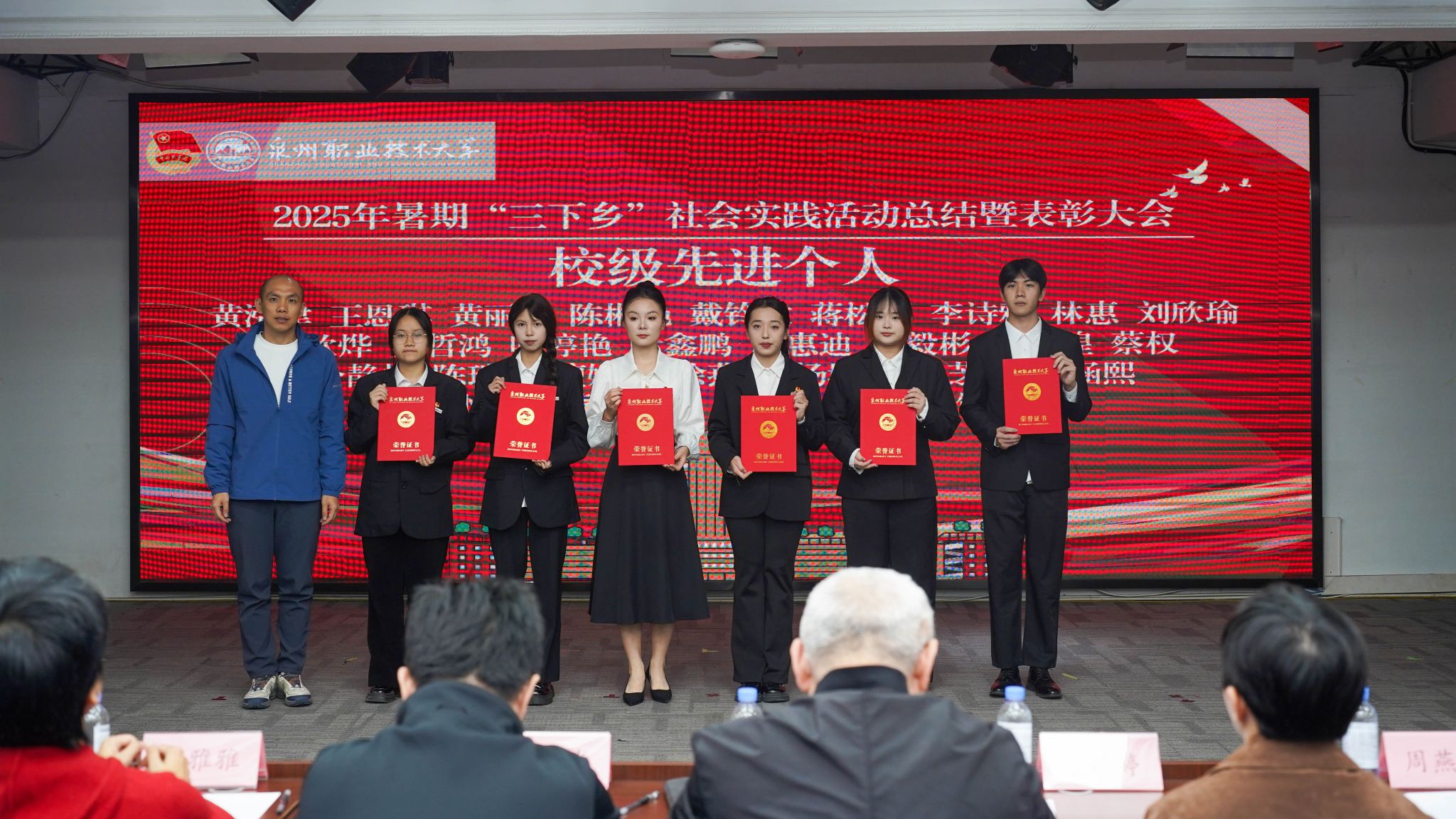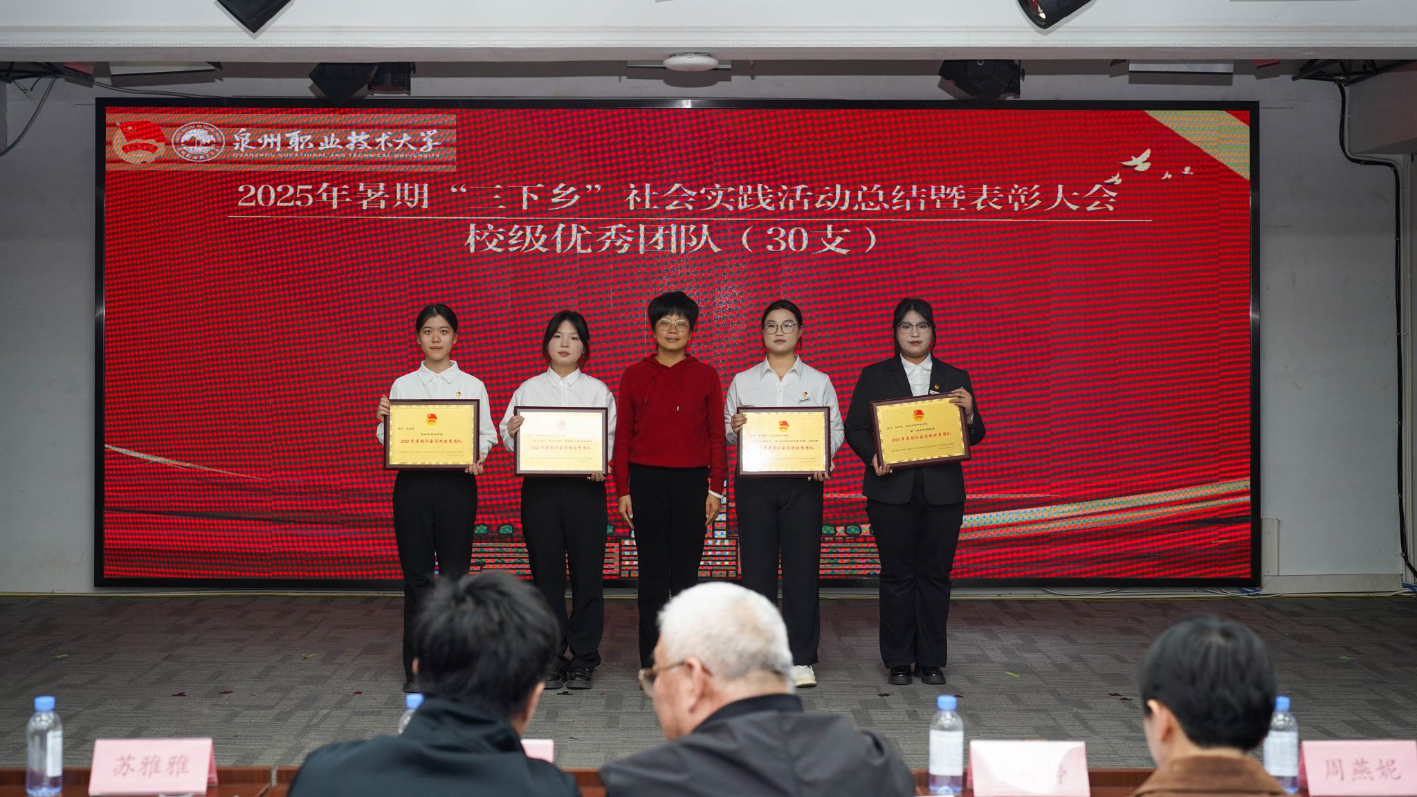 12月4日,泉州职业技术大学2025年暑期“三下乡”社会实践活动总结暨表彰大会在A633报告厅举行。晋江团市委副书记陈弘光,晋江团市委二级主任科员、组织部副部长李婷婷博士,内坑司法所所长苏雅雅,校务顾问、马克思主义学院首席专家来永宝,马克思主义学院院长杜秀娟,学工处处长、校团委书记黄胤聪,以及教务处、学工处、各二级学院负责人、各书院党团书记、实践团队指导老师和学生代表共同出席。