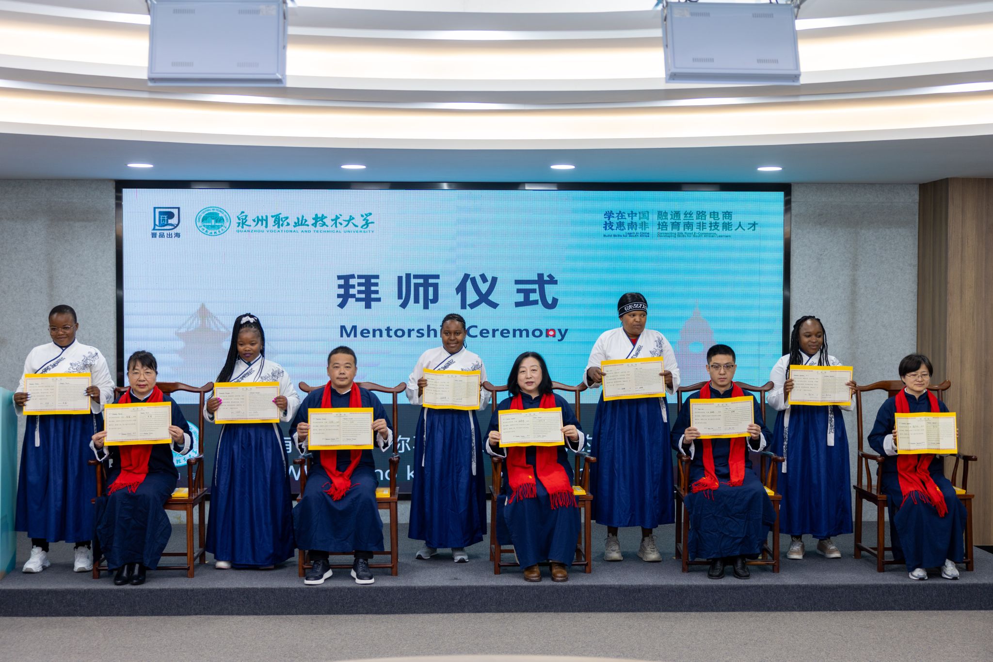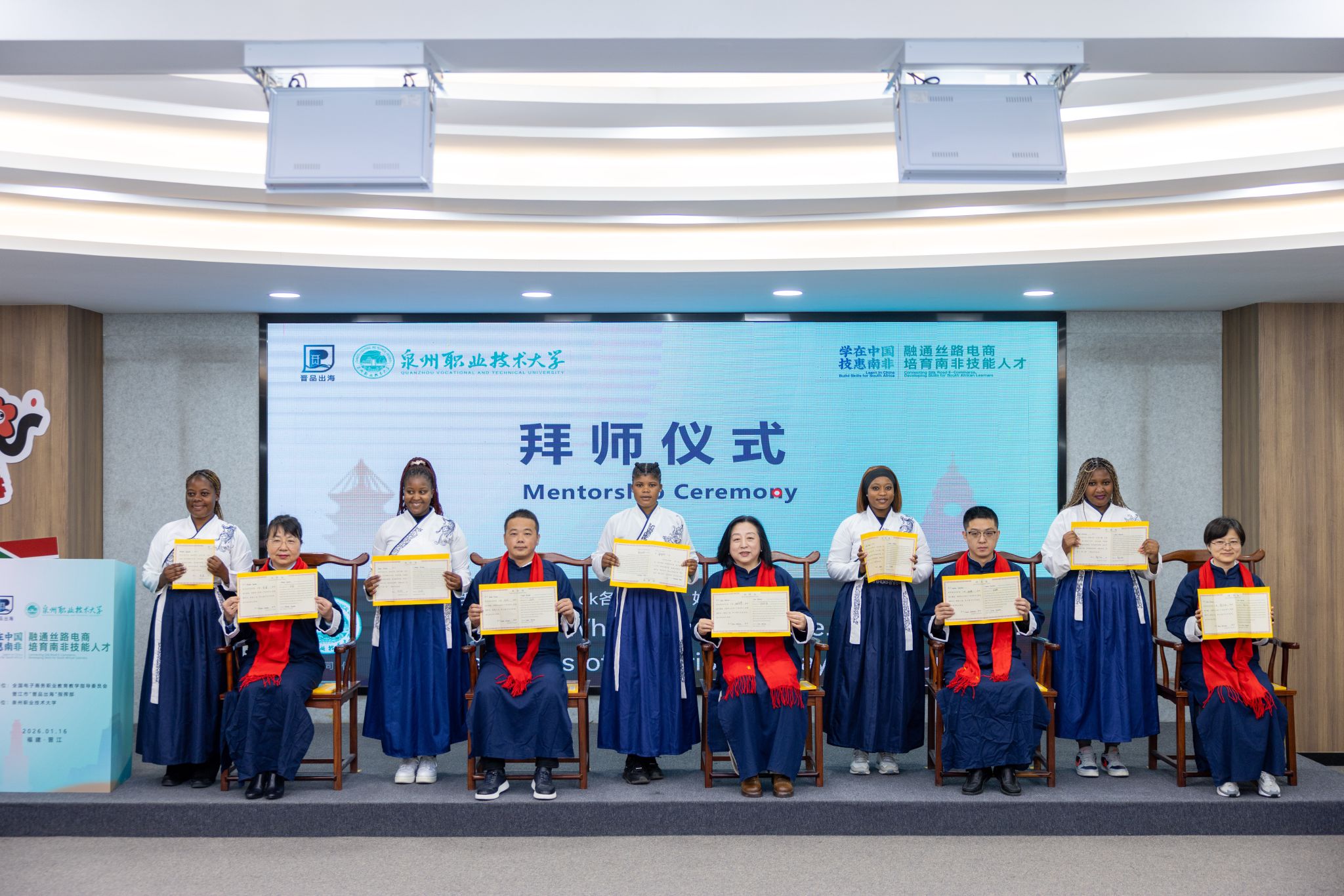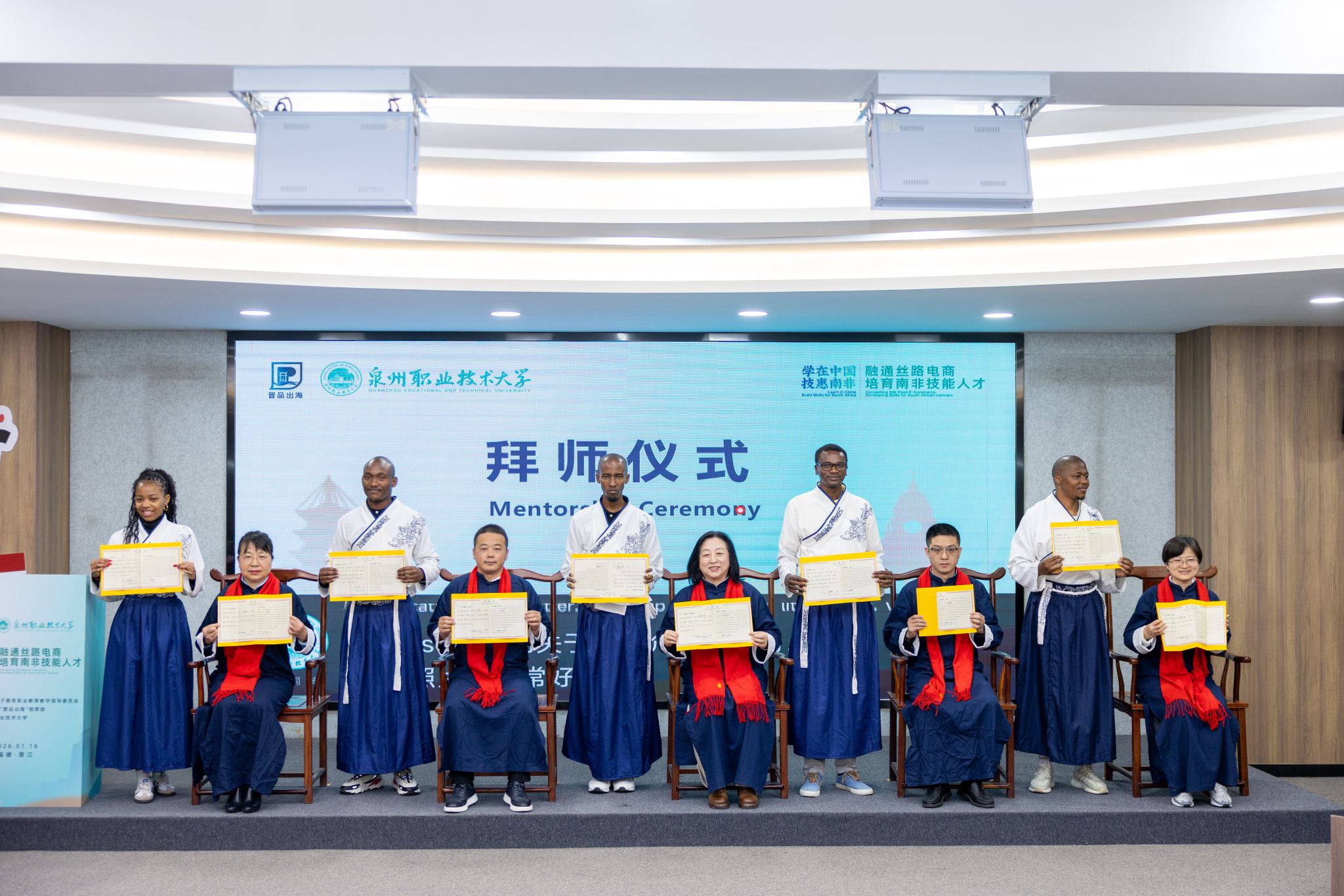 1月16日,29位南非青年企业家、学生跨越万里山海,在泉州职业技术大学参加中国传统拜师礼,和5位教授、企业导师代表缔结师徒之约。