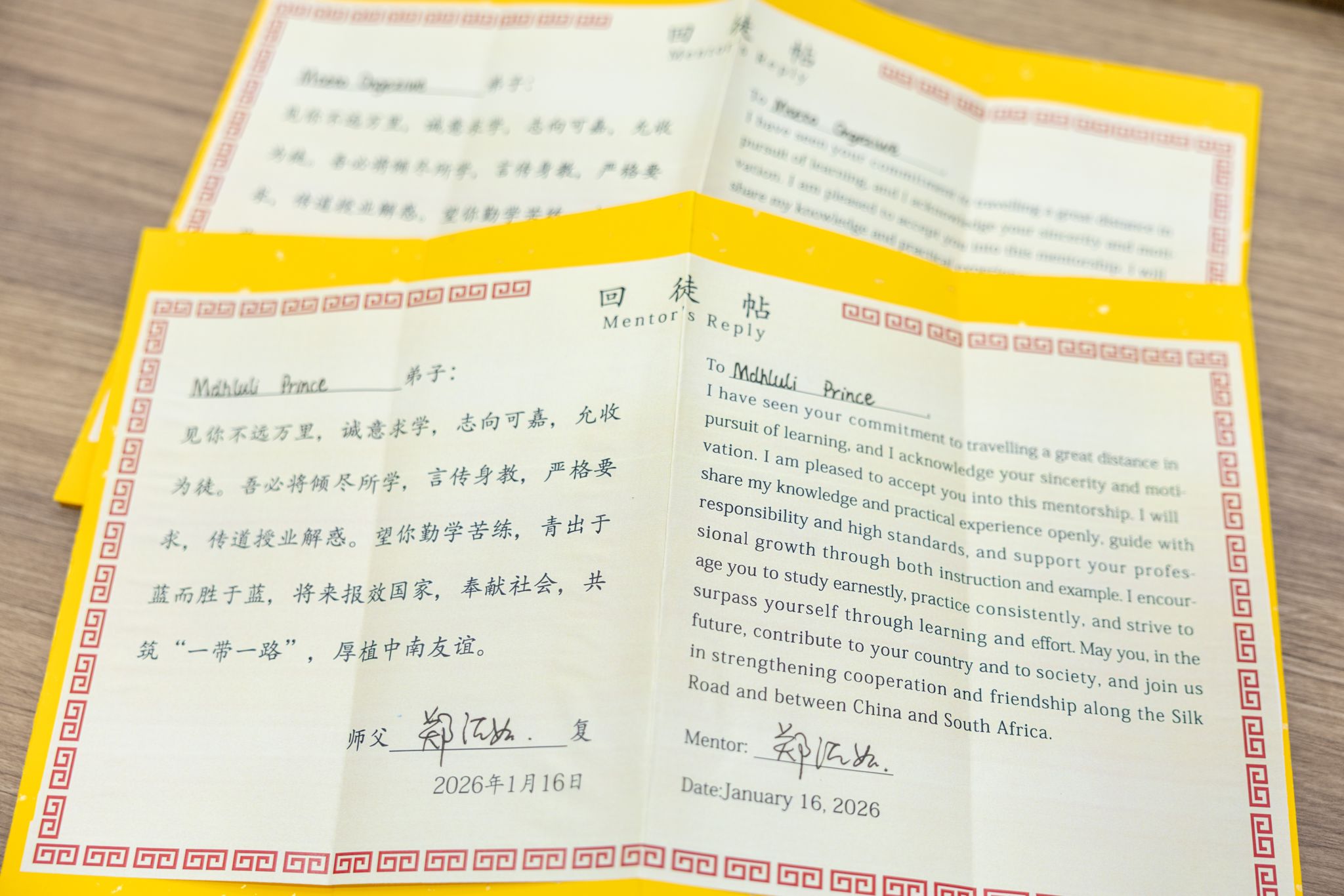 29位南非青年学员身穿汉服,分成6组一一站在老师面前,鞠躬、递帖、敬茶、回帖……在这个充满东方教育智慧与中南情谊的仪式中,学员们与博士、教授、企业家等导师一一结对。师徒结伴,心连中南,这不仅是技能传承的起点,更将不断延续中南友谊。