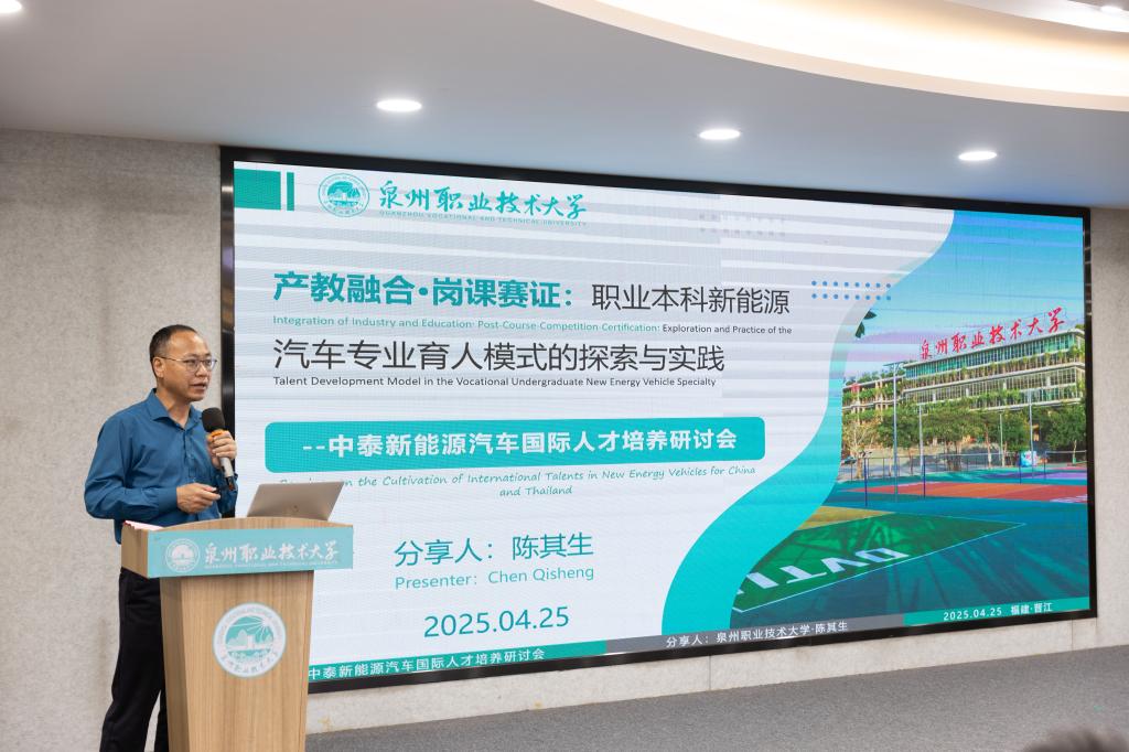 ▲ 工学院书记、副院长陈其生在中泰新能源汽车国际人才培养研讨会上做人才培养经验分享
