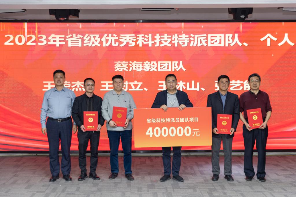 ▲ 蔡海毅(右三)团队获省级优秀科技特派员团队、王荣杰(右一)获省级优秀科技特派员