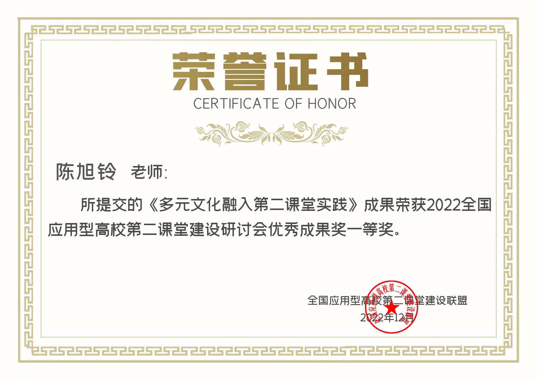▲ 《多元文化融入第二课堂实践》成果荣获2022全国应用型高校第二课堂建设研讨会优秀成果奖一等奖