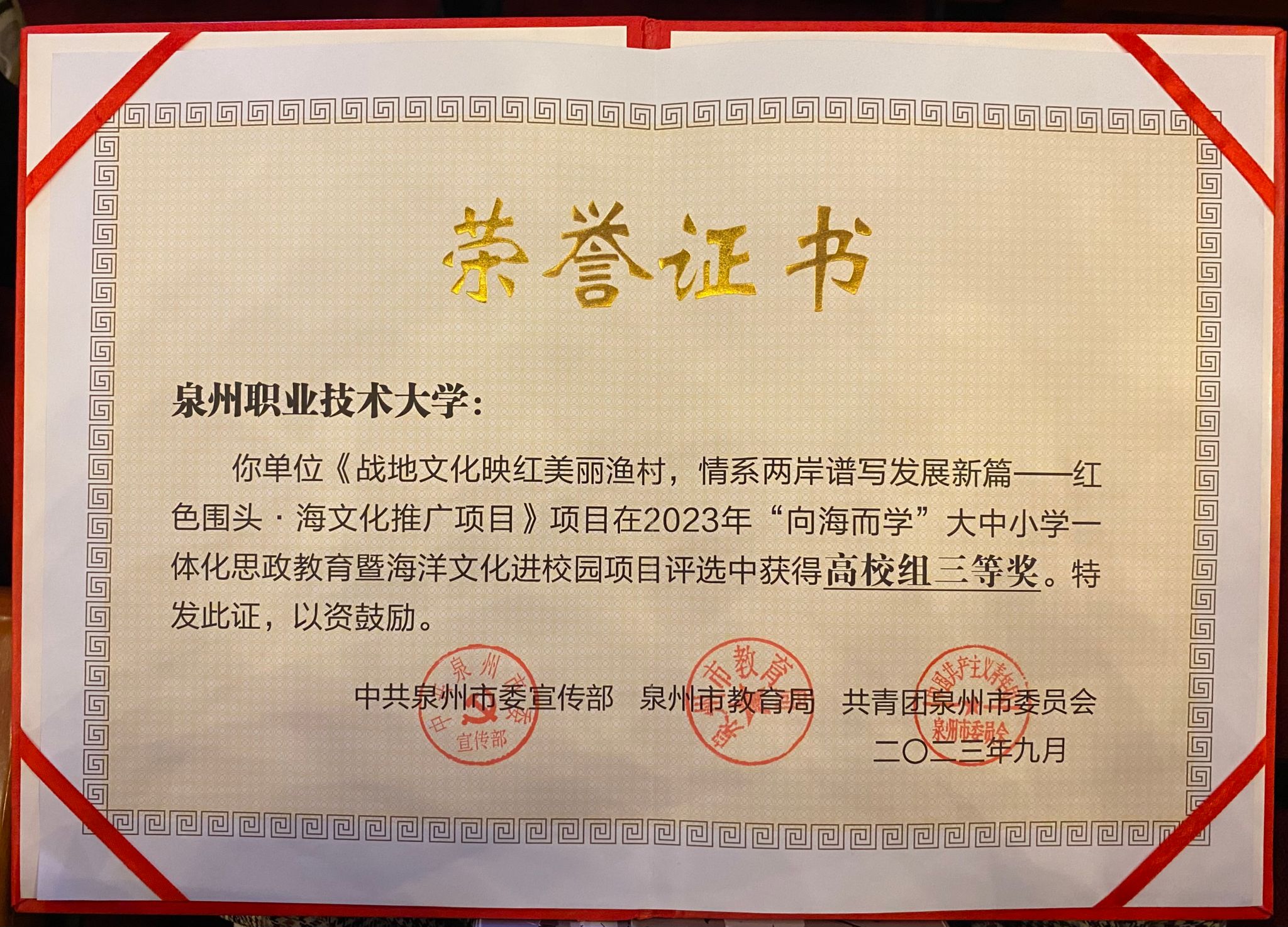 ▲ 《战地文化映红美丽渔村,情系两岸谱写发展新篇——红色围头·海文化推广项目》荣获2023年“向海而学”大中小学一体化思政教育暨海洋文化进校园项目高校组三等奖