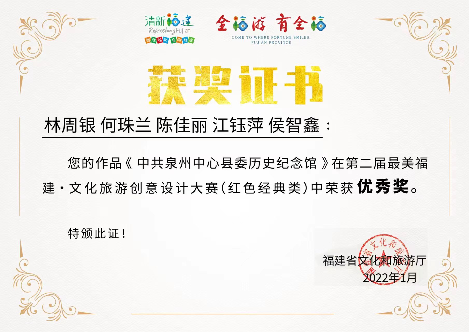 ▲ 讲解团作品《中共泉州中心县委历史纪念馆》在第二届最美福建·文化旅游创意大赛(红色经典类)中荣获优秀奖