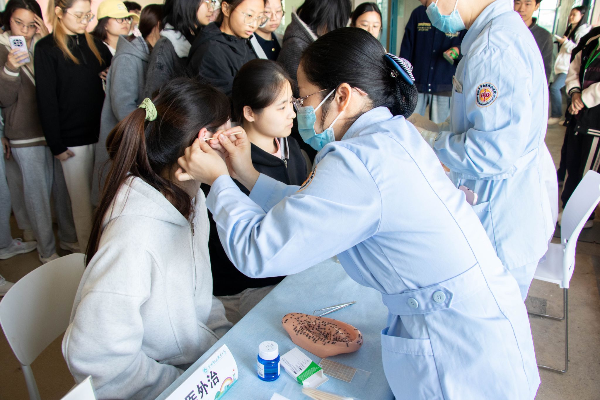 报告厅外的主楼长廊化身为互动式“中医体验馆”,人头攒动。官家靓副主任医师、张瑞婷中医师通过望闻问切为师生辨识体质,提供个性化养生指导。黄容副主任护师、吴小鑫主管护师则现场展示耳穴压豆、刮痧等中医特色护理技术。同学们在体验后纷纷感叹中医外治法的“简、便、验、廉”,对非药物治疗手段产生浓厚兴趣。