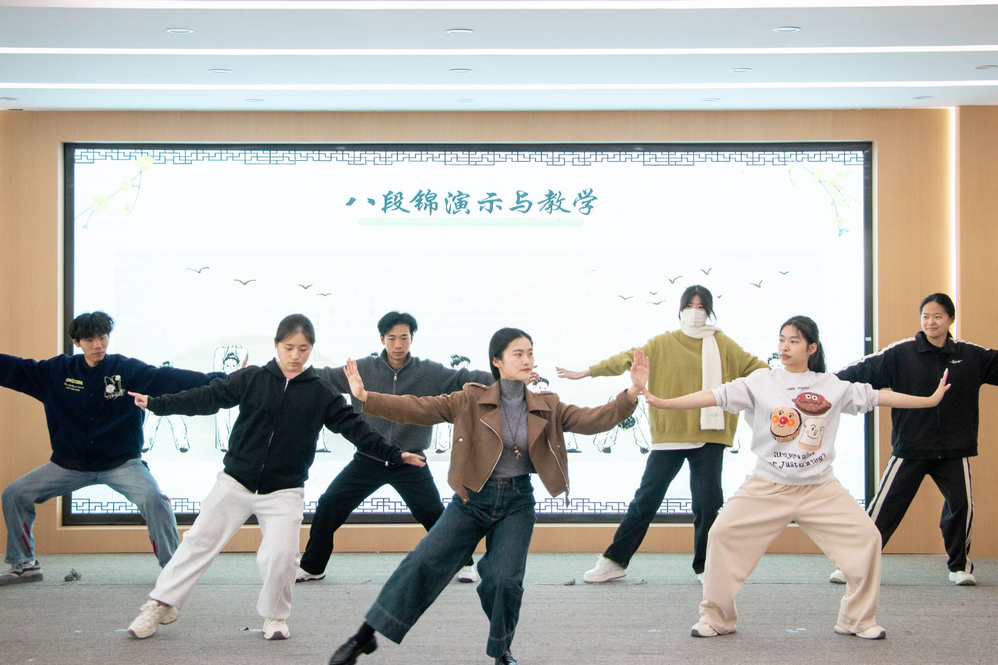 “双手托天理三焦。”在晋江市中西医结合医院吴珊珊护士的带领下,全体师生起而立行,沉浸式体验国家级非物质文化遗产——八段锦。吴珊珊对动作要领与呼吸吐纳进行分步拆解,师生们在舒展筋骨中切身感受中医养生功法的独特魅力,现场气氛张弛有度、动静相宜。