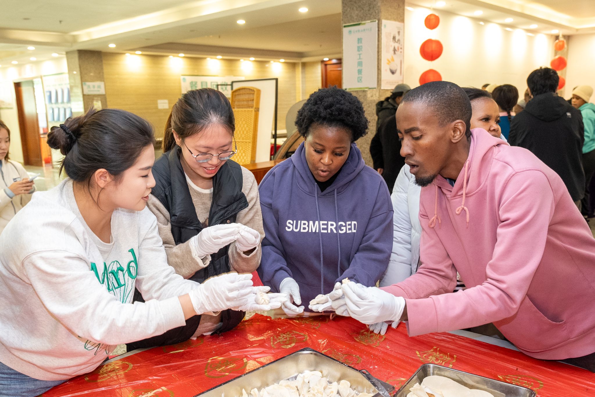 2月3日,正值闽南传统“尾牙”,泉州职业技术大学国际餐厅里热气蒸腾,墙上挂着一对对美好寓意的春联。29位南非跨境电商技能专训班的青年学员围坐一堂,和学校师生一起摊面皮、包饺子、滚元宵圆、卷润饼,提前体验浓郁的中国年味。
