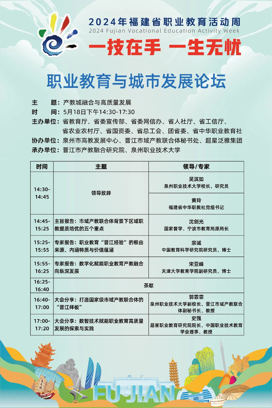 活动期间还安排参访泉州职业技术大学,导览福建省首家生态示范校园,考察职业本科试点建设成果。此外,职业教育与城市发展论坛将邀请大咖专家、实践先锋围绕市域产教联合体建设、数字化赋能职业教育等主题展开论道。