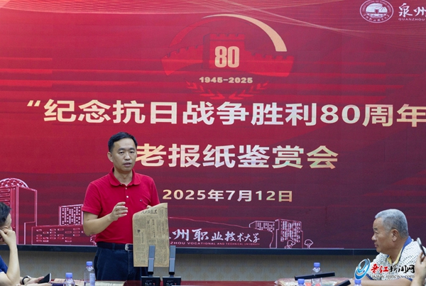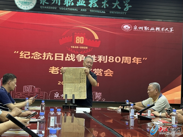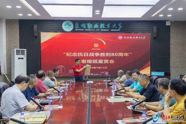 12日下午,中国报协集报分会闽粤行一行来到泉州职业技术大学参观校园,观看“没有共产党就没有新中国”报纸展览,并在该校第一会议室举行“纪念抗日战争胜利80周年”老报纸鉴赏暨座谈会。集报家们纷纷展示1945年有关日本宣布投降、中国人民庆祝抗战胜利的老报纸和红色藏品,集中研讨交流老报纸的收藏经验。著名红色报纸收藏家牛廷福先生现场还向泉州职业技术大学图书馆捐赠其主编的《日本报纸记录的侵华史实》等图书。