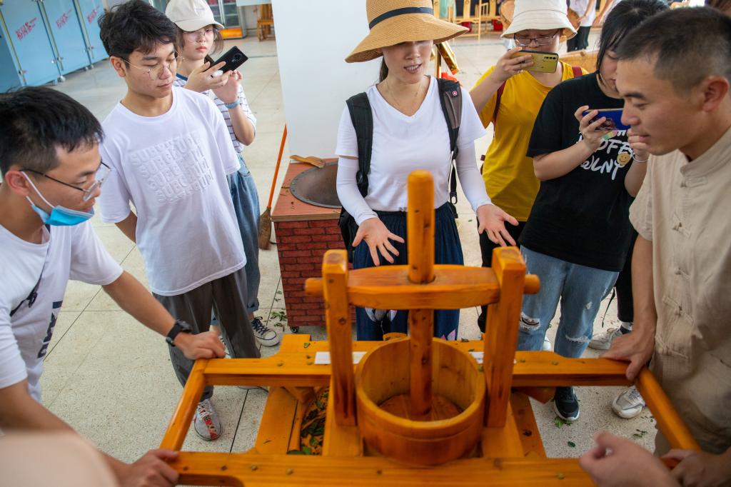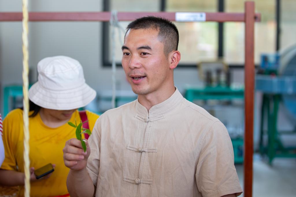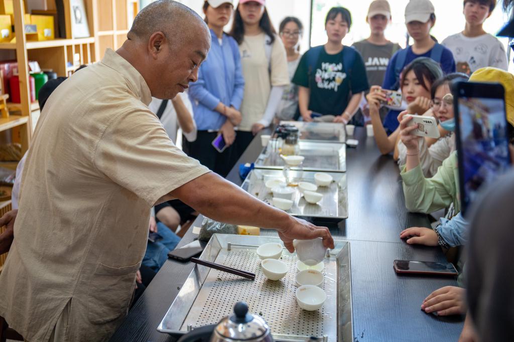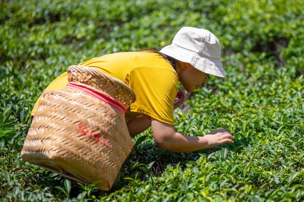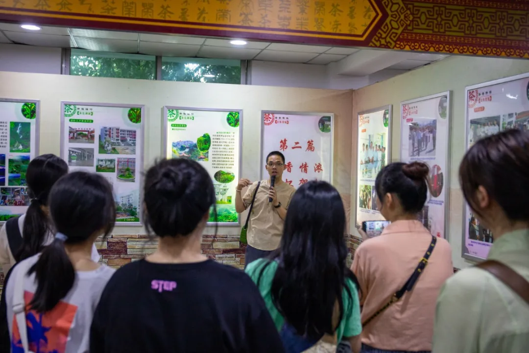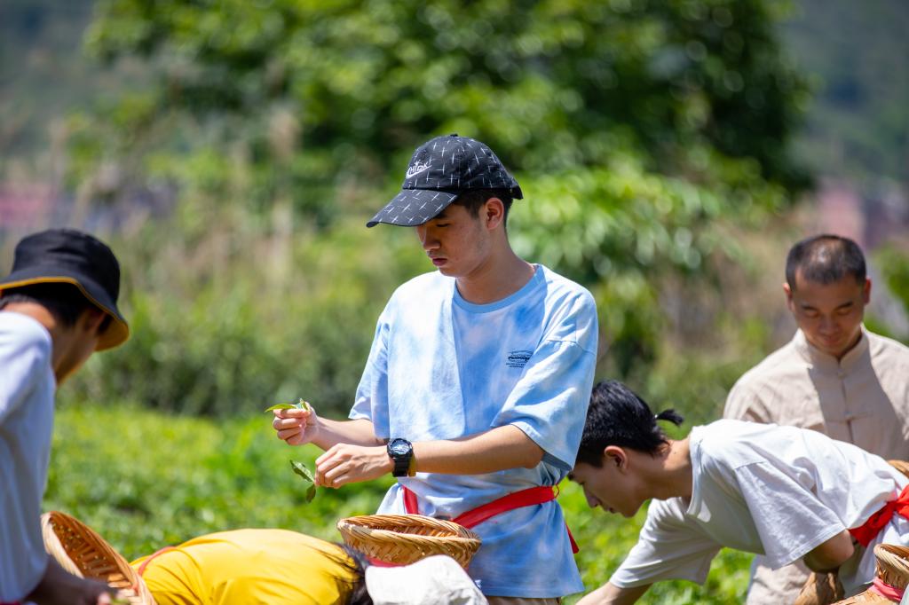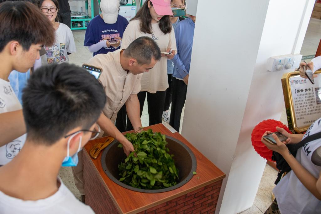 顶着烈日,背着茶篓,同学们化身茶农,在漫山遍野的茶园里采茶。虽然都汗流浃背了,但专注却写在了他们的脸上。