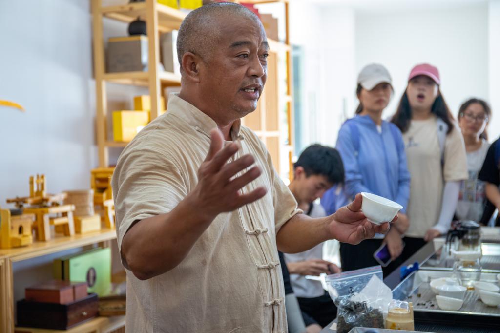 一片叶子,藏着深厚的中华传统文化,里面蕴含着怎样的传奇?当天,黄老师为同学们特地邀请来了两位铁观音非遗传承人陈艺峰、林茂安,详细为同学们讲解并演示了制作铁观音这道名茶的十二道工序。在两位茶人的指导下,学生们还亲自动手,参与制作了一泡属于自己的“绝版茶王”。