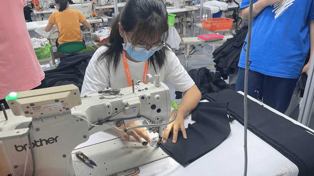 “我之前在中职有学习过一些基础的缝纫知识,但正在进入企业实操还是第一次。因为老师知道我之前的学习经历,所以把我安排在运动服衣身缝合的锁边环节。锁边机在使用的时候很容易把布料割破,用起来要特别小心。后来在老师的安排下,我这一组的组长特意过来示范给我看,告诉我一些小诀窍,还鼓励我要勇敢动手,我觉得在企业里遇到的每一个人都很好,我很愿意向她们学习。”被“委以重任”的锁边女孩易小鸿说到。