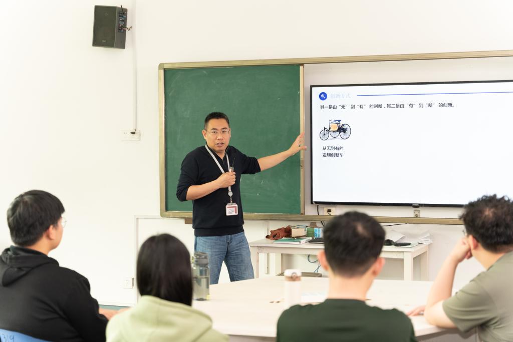 这门课授课老师蔡海毅副教授,是智能制造学院书记兼副院长。课堂上,师生讨论创新概念,学习最火的ChatGPT等前沿科技。实践中,师生提出新理念,创造新机器,去解决各种现实难题。