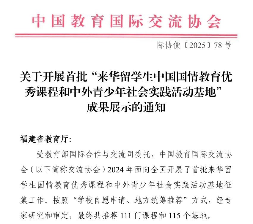 2月25日,受教育部国际合作与交流司委托,中国教育国际交流协会发布《关于开展首批“来华留学生中国国情教育优秀课程和中外青少年社会实践活动基地”成果展示的通知》,其中,泉大的《穿越海丝刺桐城》课程与厦门大学、福州大学、华侨大学等高校共同入选为推荐课程。