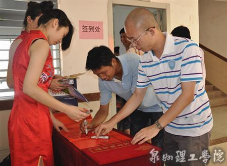 2013年7月6日下午,泉州理工学院校友总会成立大会暨理事授聘仪式在学院4号书院170会议室召开。党委书记、董事长吴金营、校长臧树良、名誉校长、校友总会会长苏志明、党委副书记、副董事长、校友总会理事长吴滨如、副校长庄文瑞等校领导与来自福州、厦门、漳州、广东、海南等地的校友代表40多人出席了大会,会议由校友总会副会长、秘书长林文艺主持。