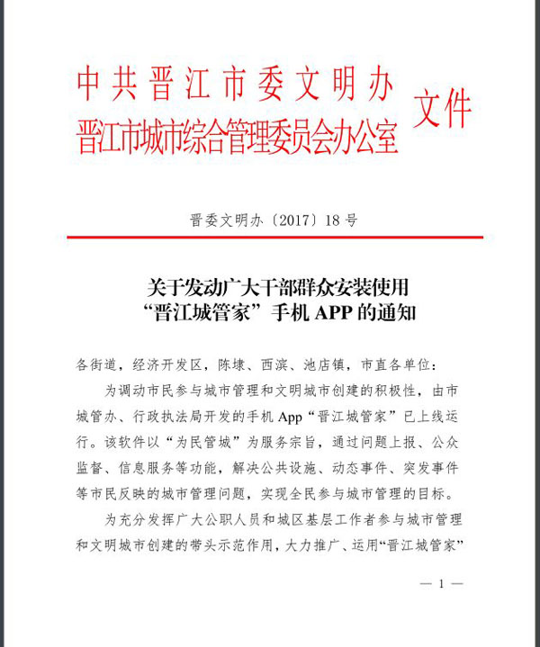 为充分发挥我校师生参与城市管理和文明城市创建的带头示范作用,大力推广、运用“晋江城管家”手机APP,经决定发动广大师生广泛安装、积极使用。
